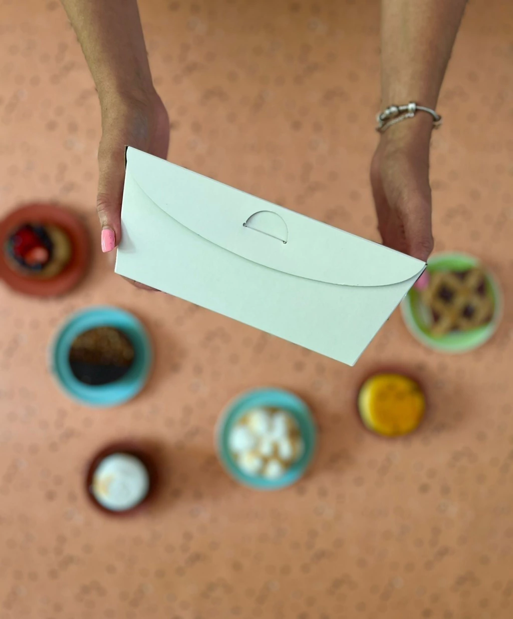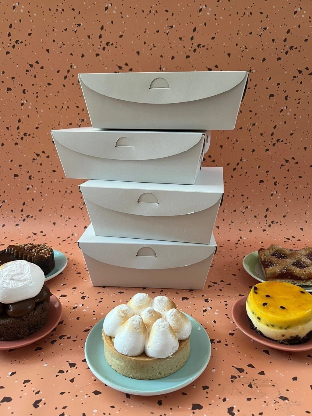 Realizada en cartulina RECICLADA de 290 grs. ♻️, esta caja es una opción sustentable para la presentación y transporte de tus mini tortas.